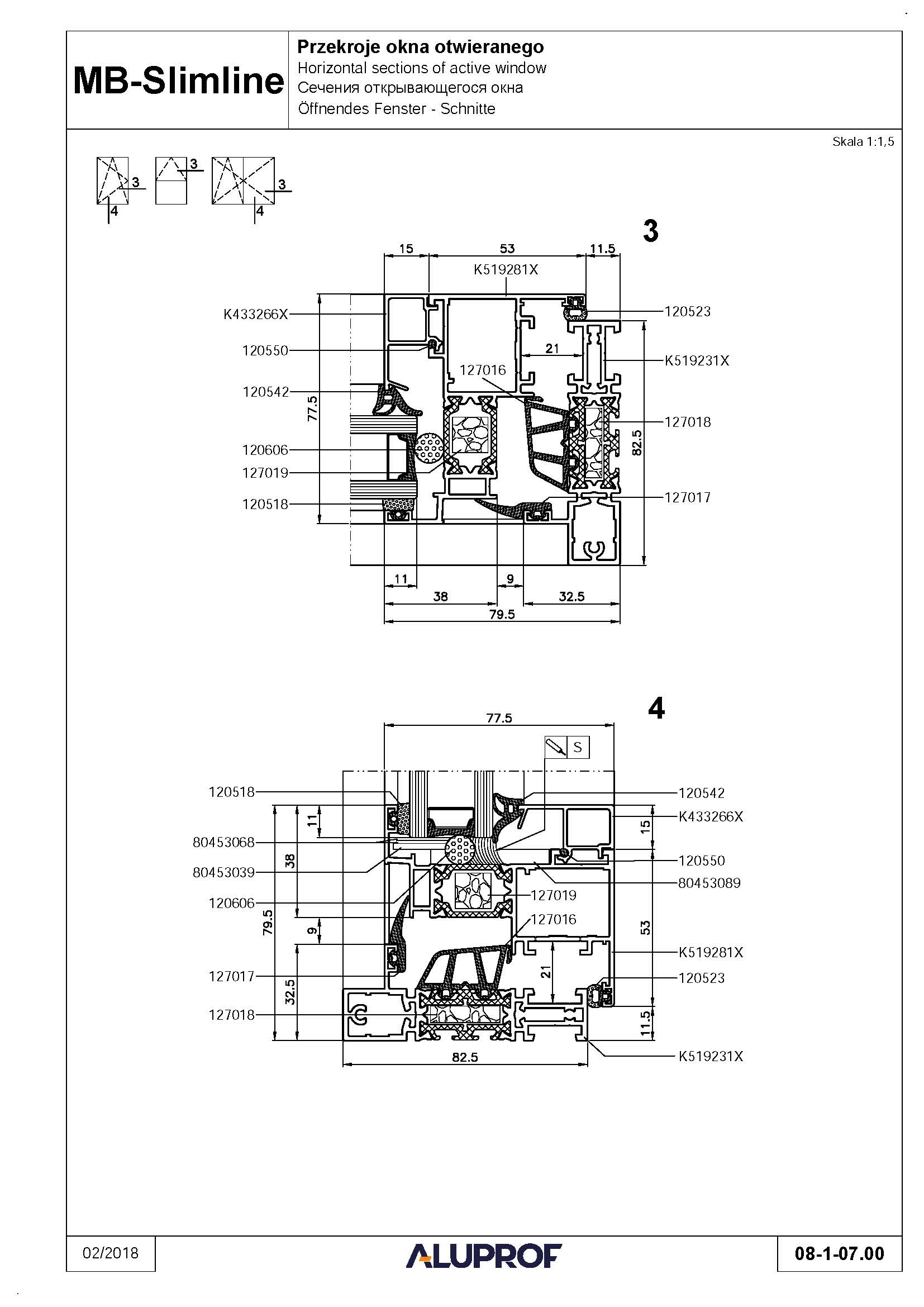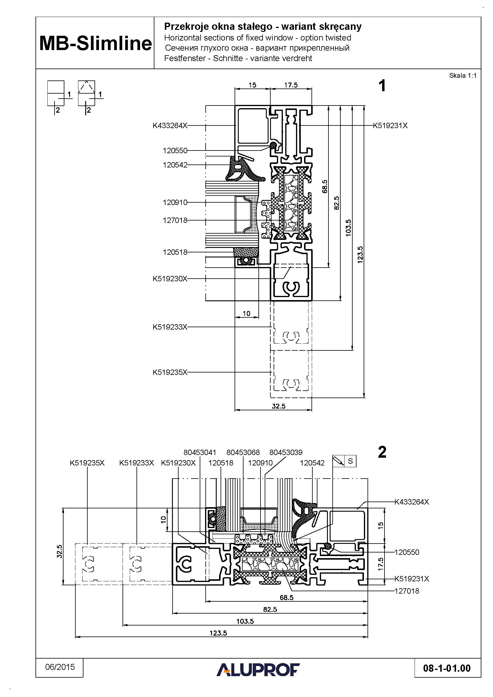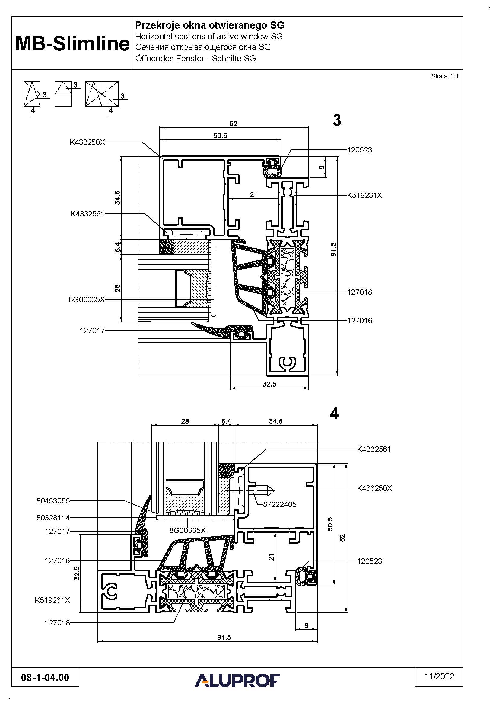 - Конструктивная ширина видимых алюминиевых профилей в неподвижных и активных окнах (опция SG) составляет 32,5 мм для рам и 47,5 мм для поперечных и перекладин. Ширина одинакова для всех профилей независимо от их прочности, толщины остекления и т. д. Ширина видимых профилей активных окон, предлагаемых в качестве опции с видимой створкой, составляет, соответственно: 79,5 и 94,5 мм. Конструктивная глубина оконных профилей варьируется и составляет от 68,5 мм до 123,5 мм (тип A) и от 90,5 мм до 145,5 мм (тип B) и зависит от используемых стеклопакетов (одно- или двухкамерных) и от требуемой прочности профилей. Также возможно использование других профилей, например, соответствующих специфическим требованиям здания.